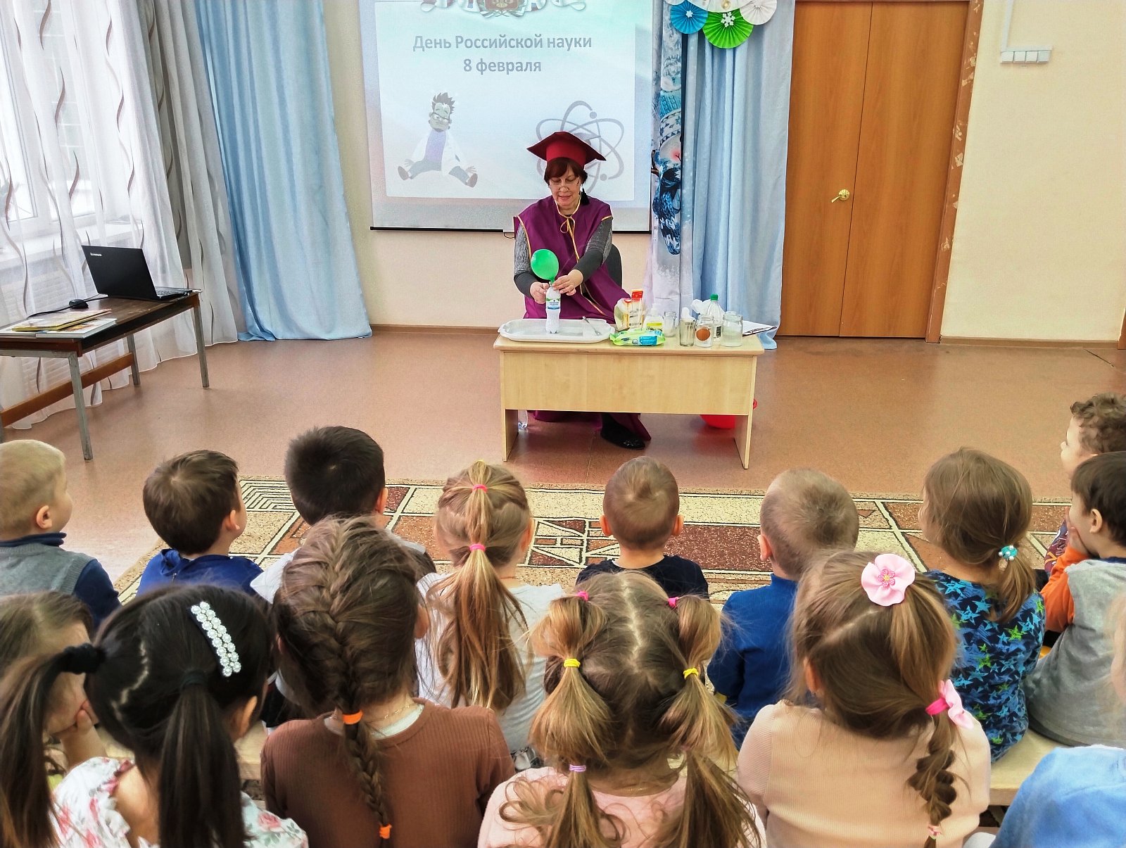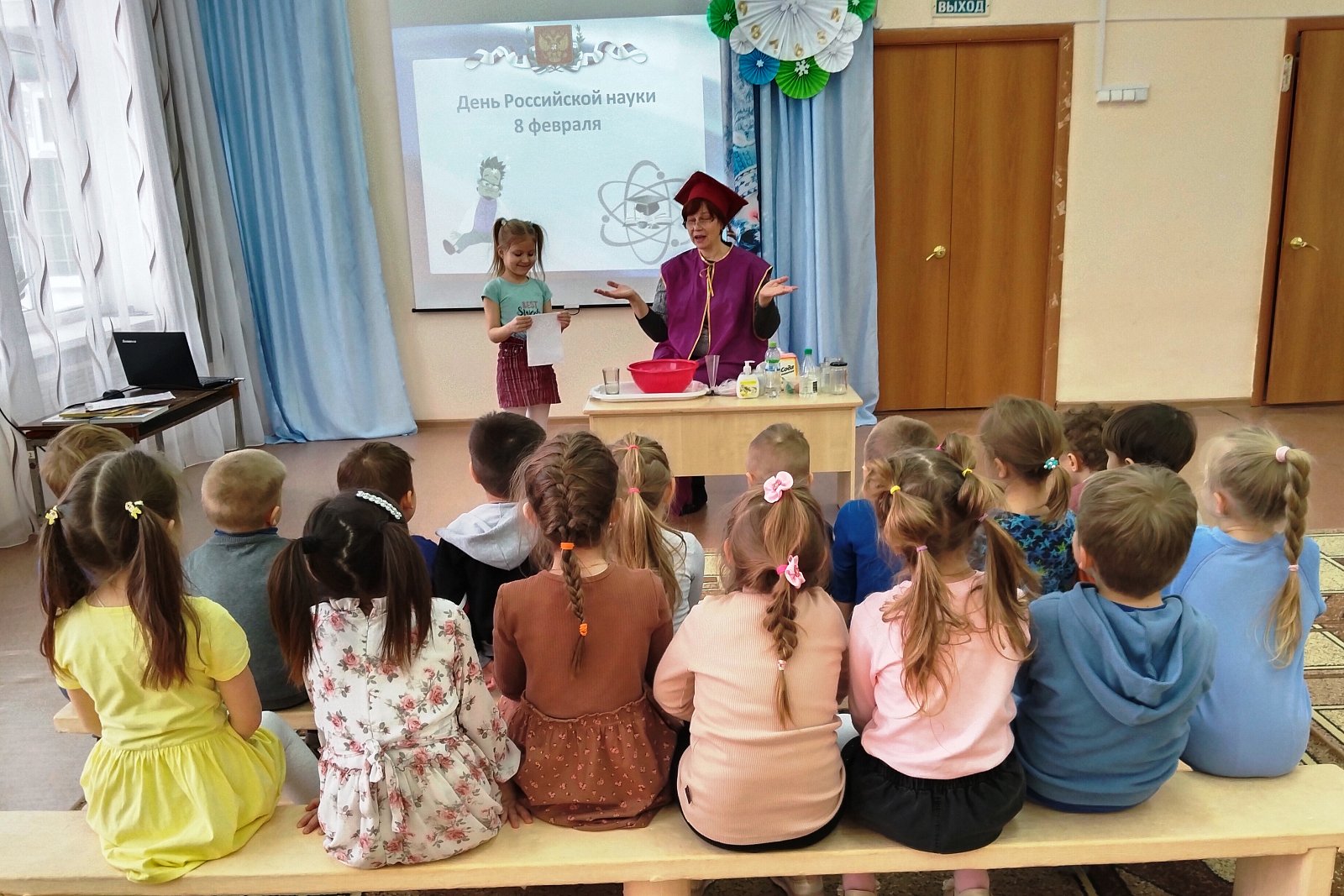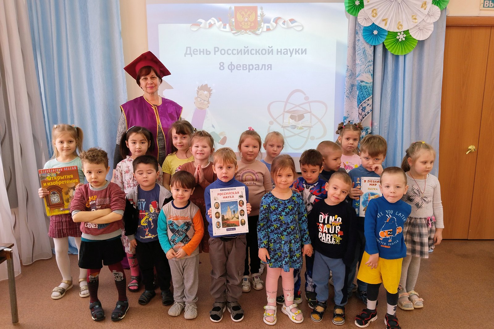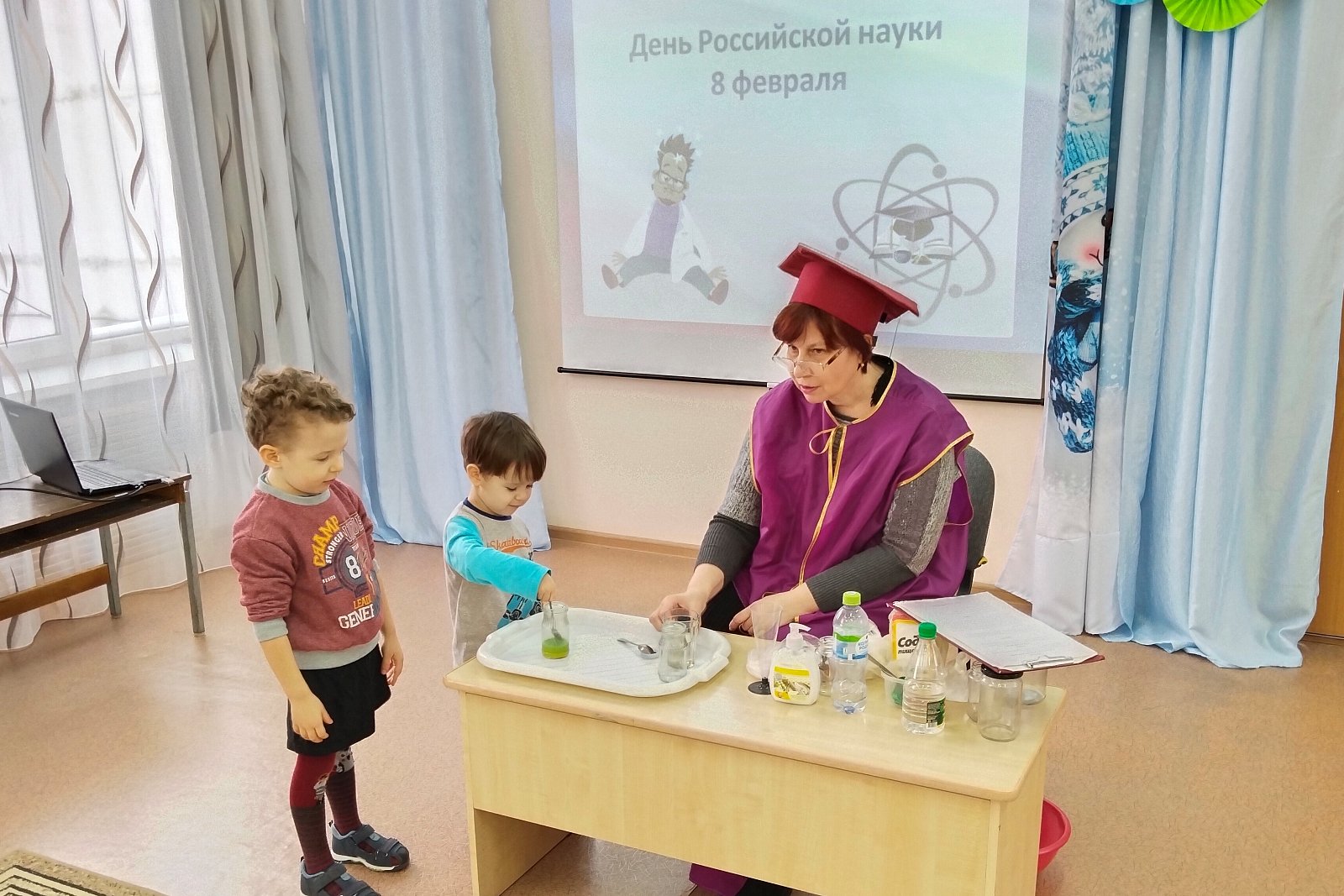 В гости к ребятам детского сада пришла госпожа Наука. Она познакомила детей с историей праздника – Днём российской науки, рассказала о выдающихся российских учёных, о том, кто такие учёные и чем они занимаются, и предложила превратиться в учёных.