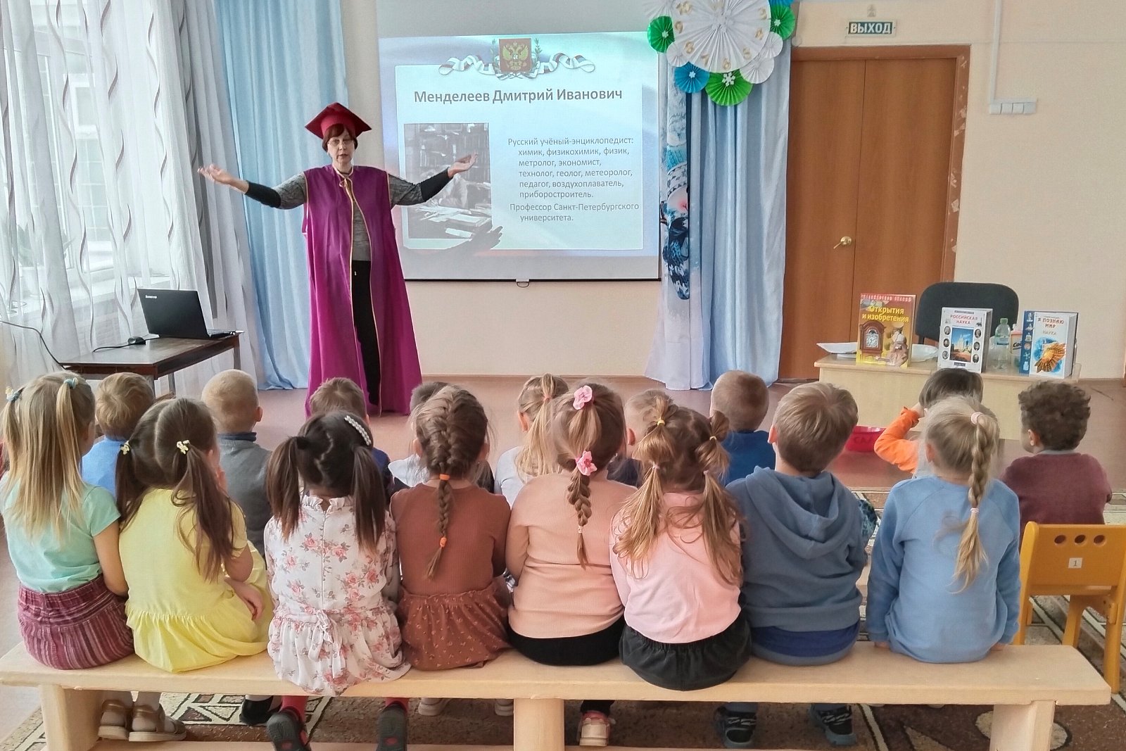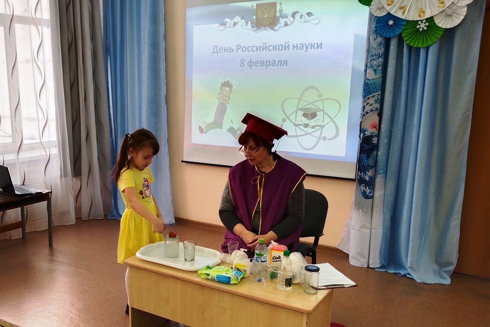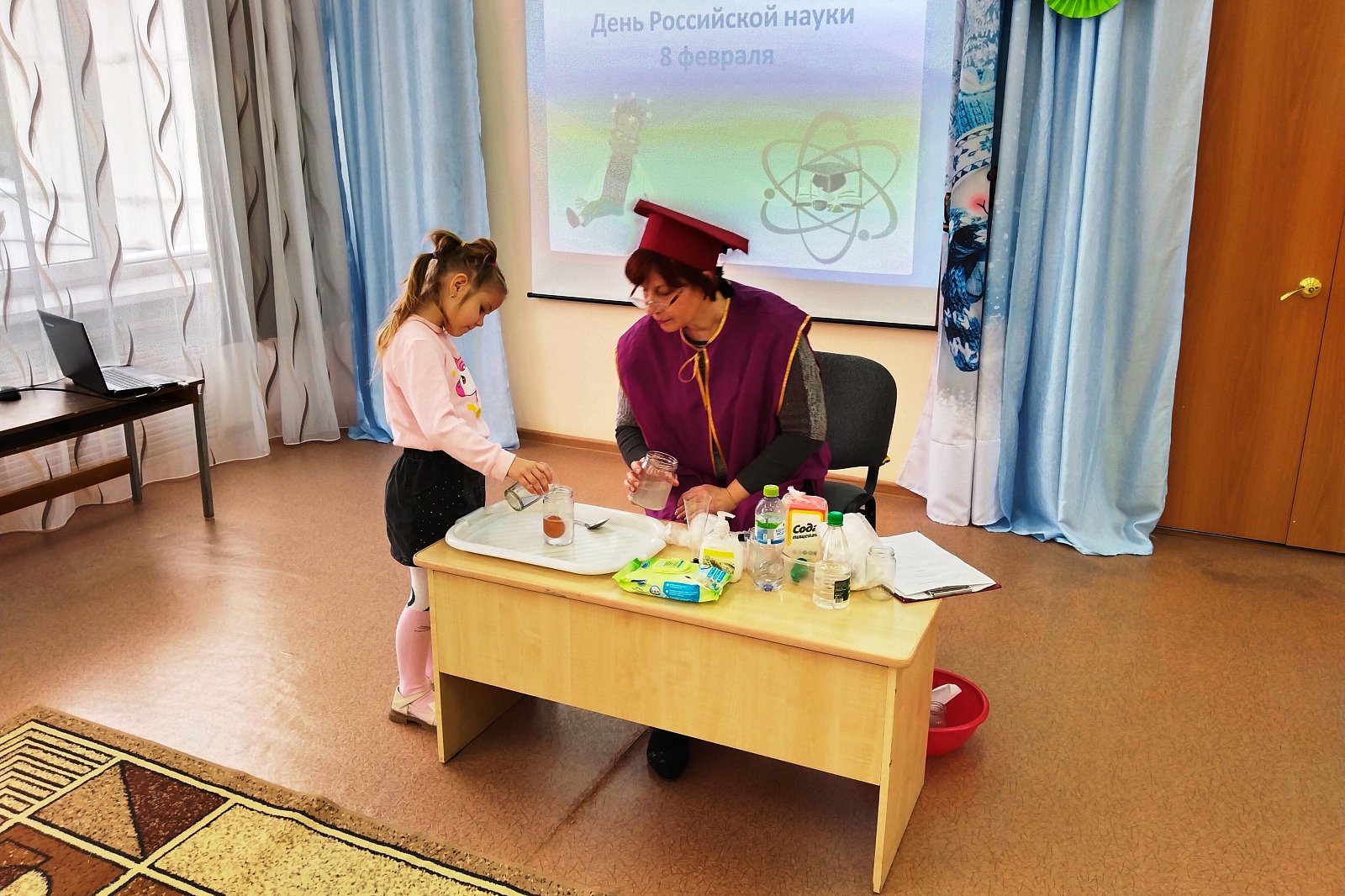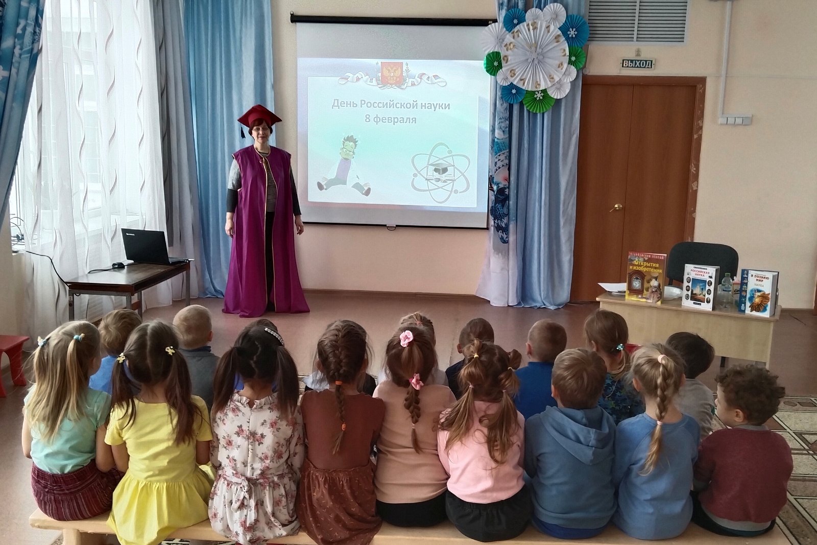 В гости к ребятам детского сада пришла госпожа Наука. Она познакомила детей с историей праздника – Днём российской науки, рассказала о выдающихся российских учёных, о том, кто такие учёные и чем они занимаются, и предложила превратиться в учёных.