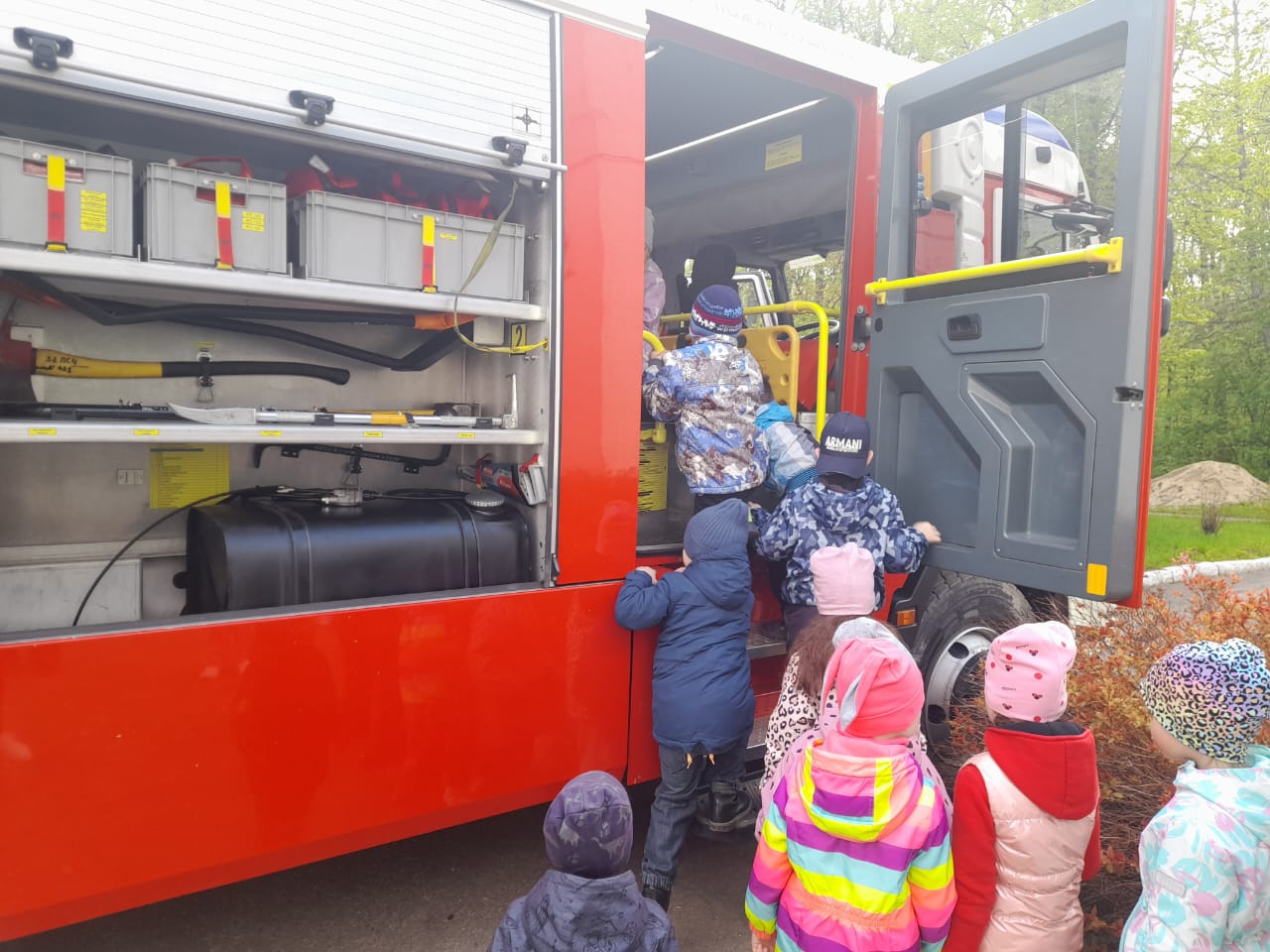 Дети рассматривали оборудование пожарной машины, садились по очереди в кабину.